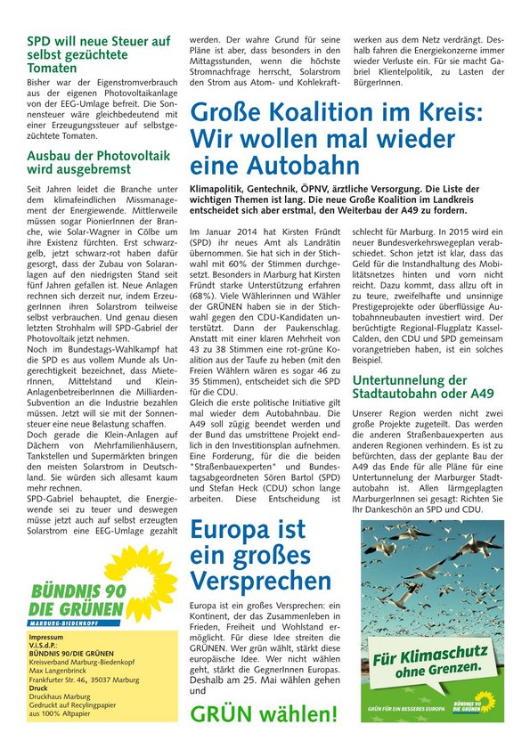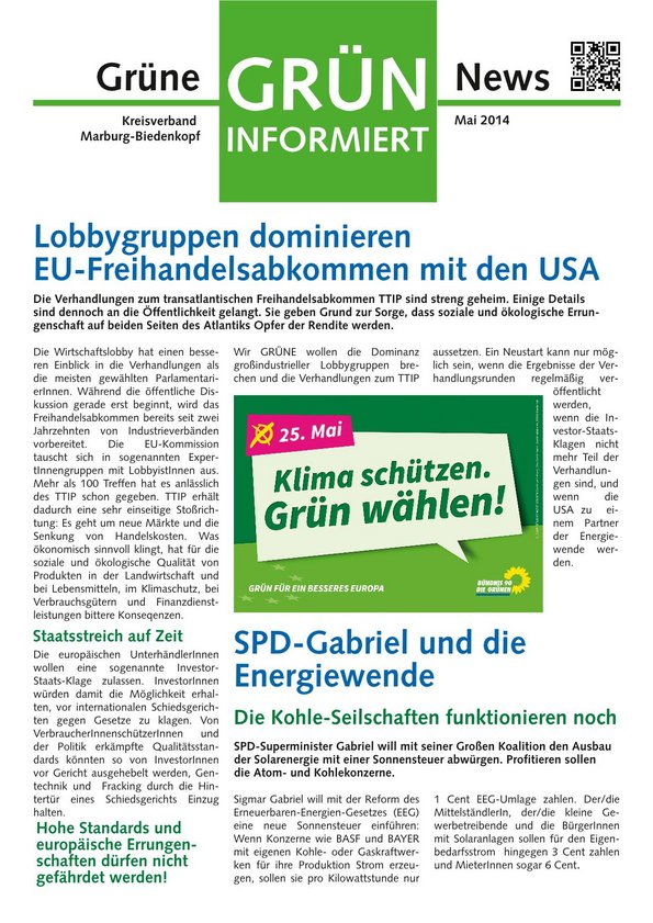 Europa ist Freiheit. Entscheidungsfreiheit. Durch das direkt gewählte Europaparlament setzen Bürgerinnen und Bürger der EU dem Binnenmarkt Regeln: gegen giftige Chemie und Gentechnik im Essen. Für mehr Erneuerbare Energien und Banken, die endlich den Menschen dienen. Das ist ein Gewinn dank der Vereinigung Europas. Denn Deutschland ist im globalen Maßstab inzwischen zu klein für eine soziale Marktwirtschaft. Große Konzerne können einzelne Länder gegeneinander ausspielen. Auch die Banken haben das in der Krise oft getan. Nur gemeinsam kann die EU die Bedingungen diktieren. Die Transatlantische Handels- und Investitionspartnerschaft, kurz TTIP, wird bisher vor allem für Chlor- desinfizierte Hühnchen, Genmais und Rindfleisch voller Hormone kritisiert. Auch wir wollen gesundes Essen, das sind richtige Argumente. Aber noch gefährlicher ist der Angriff durch TTIP auf unser demokratisches Recht, unsere Marktwirtschaft sozial und ökologisch gestalten zu können.