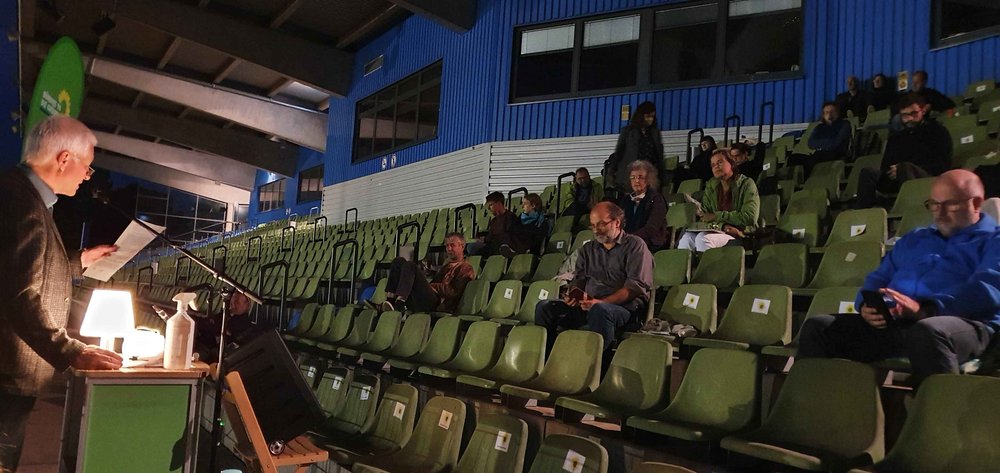 Wegen Corona war der Parteitag am 27. August nach draußen verlegt worden auf die Tribüne des Georg-Gassmann-Stadions. Dort fanden sich fast 60 Mitglieder ein zu Rechenschaftsberichten und Wahlgängen. Etliche Anwesende waren Neumitglieder die sich auch kurz vorstellten.