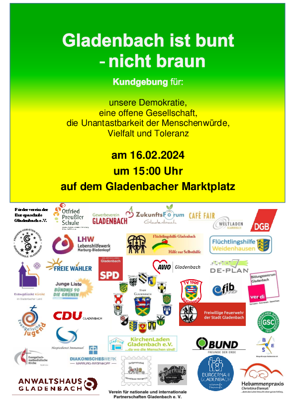 Sofern danach noch Zeit ist, wird es eine Demo durch die Gladenbacher Innenstadt geben. Das Bündnis und die Polizei rechnen mit 1.000 bis 2.500 Teilnehmenden.