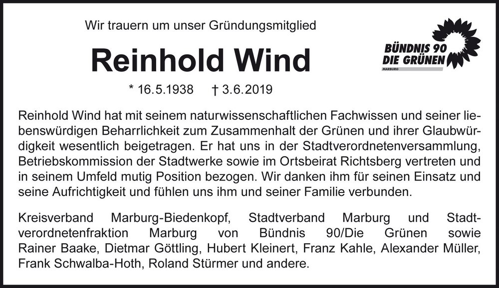 Reinhold Wind, Gründungsmitglied der Marburger Grünen 1979 und aktiv bereits in den Vorgängerorganisationen „Grüne Aktion Zukunft“ und in der „Sonstigen Politischen Vereinigung“, die 1979 zur Europawahl antrat, verstarb 81jährig im Juni in Marburg.