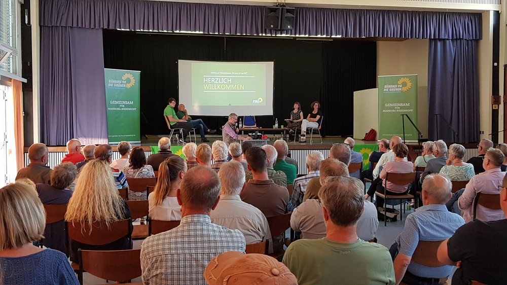 "Im Bürgerhaus in Lohra ist alles für einen munteren Abend angerichtet. Das Thema „Wie weiter mit dem Wolf?“ polarisiert die Menschen, vor allem jene, deren Nutztiere dem Hunger des ehemals vertriebenen Jägers zum Opfer fallen können. Zu ihnen gehören sehr viele der rund 80 Zuhörer. Aber auch auf dem Podium ist Kontroverse angesagt. In Michael Weiler, Tierarzt, Jäger und Wolfsbeauftragter des Pferdesportverbands Hessen, sowie Felix Hoffarth, Rinderzüchter aus Lohra, haben die beiden Vertreter der Grünen im Landkreis Marburg-Biedenkopf einen starken Widerpart.