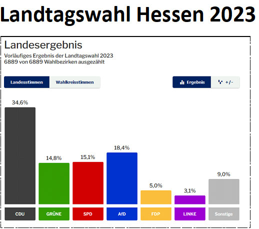 Die AfD wird mit 18,4% der Stimmen und einem Zugewinn von 5,3% deutlich zweitstärkste politische Kraft in Hessen. Das ist das bislang beste Stimmenergebnis der AfD in einem westdeutschen Bundesland. Die AfD wird künftig 28 Abgeordnete in den hessischen Landtag entsenden.