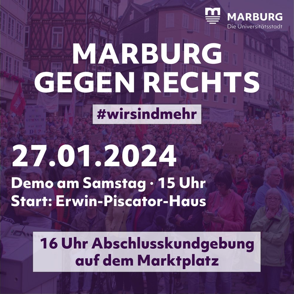 Die Stadt Marburg lädt für Samstag, den 27. Januar 2024, die Zivilgesellschaft der Stadt und des Landkreises zu einer Demonstration mit dem Titel "Marburg gegen rechts #wirsindmehr" ein. Der Demonstratiuonszug startet um 15 Uhr am Erwin-Piscator-Haus und endet mit einer Abschlusskundgebung um 16 Uhr am Marktplatz.