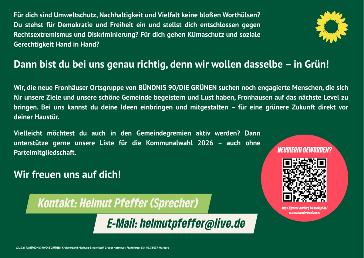 „Die Ortsgruppe Fronhausen von BÜNDNIS 90/DIE GRÜNEN will sich dafür einsetzen, unsere schöne Gemeinde zu einer noch lebenswerteren zu machen. Wir streben daher Klimaneutralität genauso an wie den Ausbau zukunftsfähiger lokaler und ressourcenschonender Wirtschaft, die Verbesserung der Infrastruktur einschließlich der Anbindung an öffentliche Verkehrsmittel und der Wohnraumsituation, verstärkte Inklusion, ein breiteres Kulturangebot, mehr Möglichkeiten für die Jugend und den Erhalt unserer gesunden Natur. Wir werden dabei konsequent unsere Demokratie und Freiheit verteidigen und gegen Rechtsextremismus eintreten.“